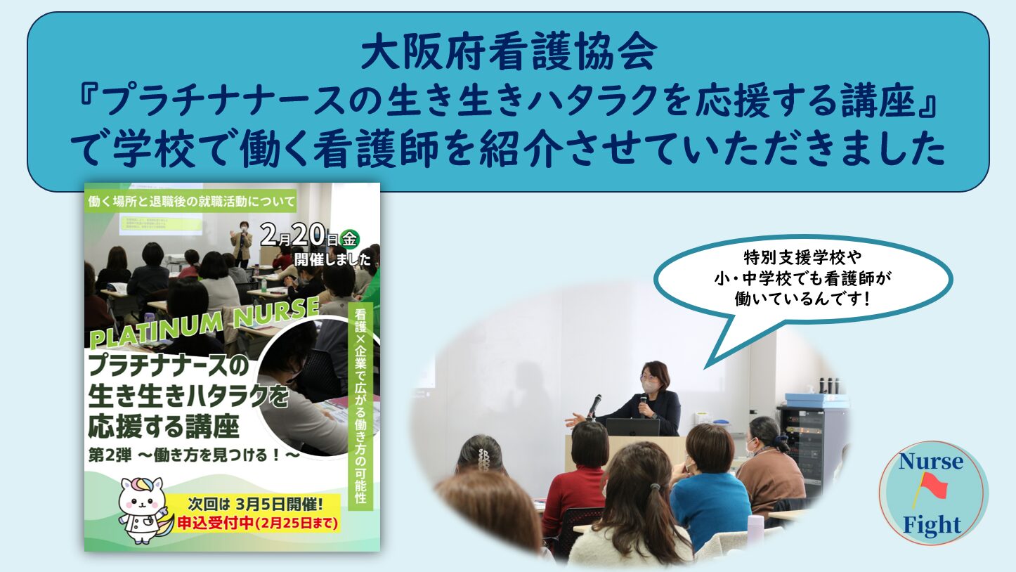 先日私は大阪府看護協会が主催する「プラチナナースの生き生きハタラクを応援する講座」で学校で働いている看護師の事を紹介する機会をいただきました。